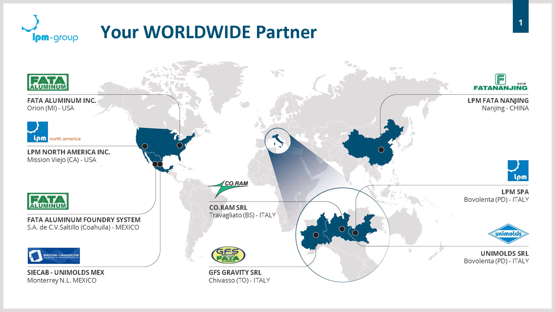Our worldwide presence includes the USA, Mexico, Italy, China with manufacturing facilities and representative offices all around the world.