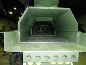 The conveyor chute is wear-resistant and replaceable. The trough and hood of the vibrating conveyor form the cooling tunnel that can be arranged linearly or combined with curves. As a two-mass system, the vibrating conveyor secures the transport of casts through the cooling tunnel regardless of their load. A frame supported by compression springs reducing dynamic loads in the foundation completes the system. Frequency inverters control the drive motors. The cooling tunnel is supplied with cooling air by fans. For efficient cooling, a computer- controlled nozzle system systematically sprays water into the cooling air stream.