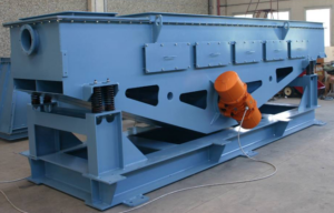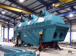 A chiller consists of a vibrating conveyor with a connected air box and a permeable flow bottom made of special steel. Vibrating drive is provided by unbalanced motors or JML directed exciters. Frequency inverters ensure the optimal transport speed of the sand used. The cool air fan produces the necessary cooling air. A fixed hood with integrated humidifier, temperature probe and humidity sensor completes the cooler. The PLC is connected to a touch screen with humidity measurement and regulation system and provides consistent sand quality.